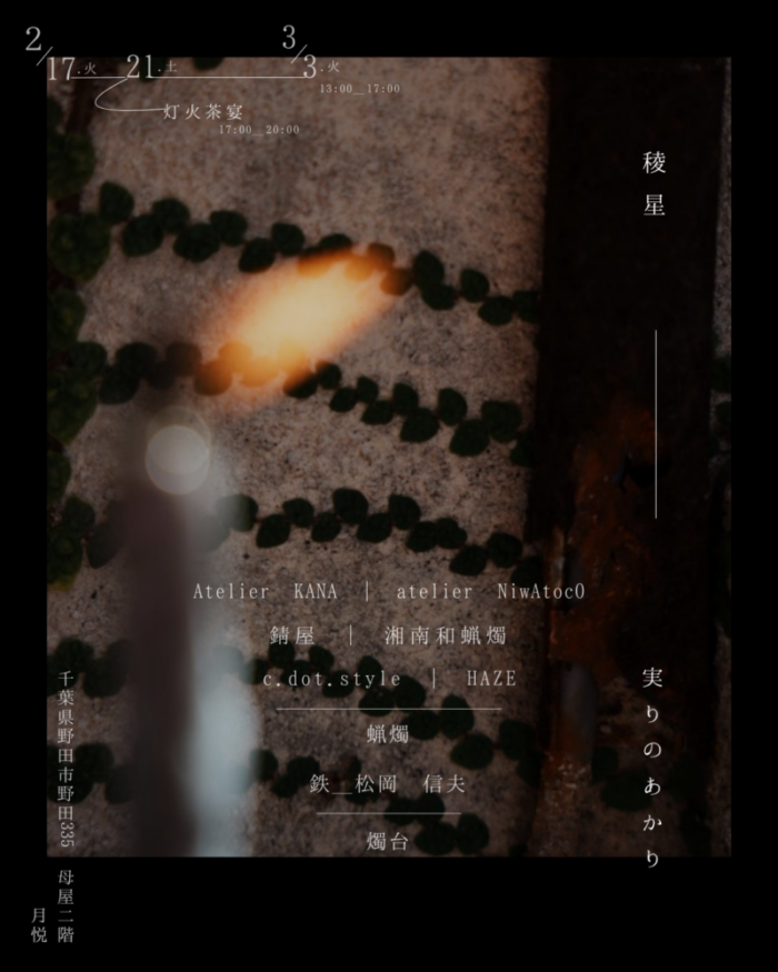稜星 ___ 実りのあかり 展 2026 1/28 blog 2026-01-28 こちらの展示会に参加いたします。 ご都合がよろしければ、ぜひお立ち寄りください。 詳細 blog よかったらシェアしてね! URLをコピーしました! URLをコピーしました! HAZE 3rd solo exhibition 唯物唯心 この記事を書いた人 haze 関連記事 HAZE 3rd solo exhibition 唯物唯心 2025-12-01 繁忙期の営業について 2025-10-29 10周年の灯火を、この手から 2025-07-18 春いろ野山のミュゼ・マルシェ 2025-02-26 干支マッチ 巳 2025-02-17 冬季休業のお知らせ 2024-12-20 HAZE和蝋燭 exhibition 2024「中道」 Middle Path 2024-12-04 和蝋燭作り体験・大阪・2024/7/21(日) 2024-07-17