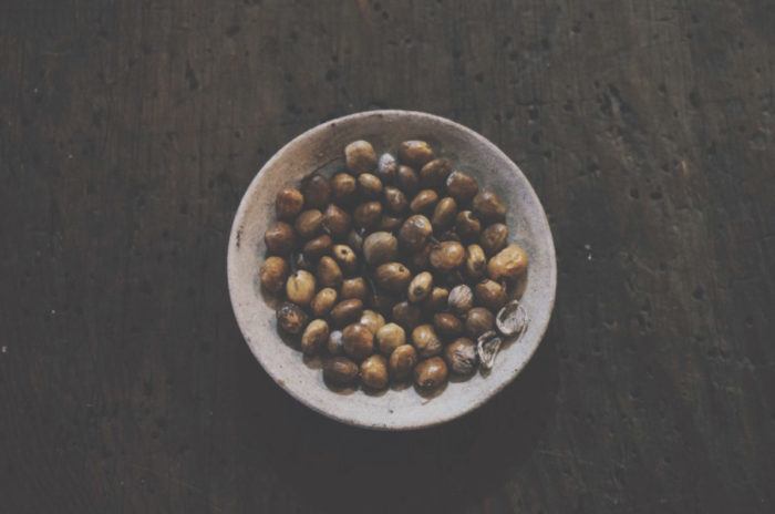 収穫された櫨の実は砕いた後、蒸して絞り出します。